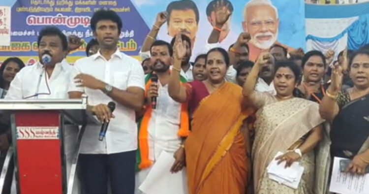 இந்த ஆர்ப்பாட்டத்தில் காஷ்மீரில் தீவிரவாதிகளால் சுட்டுக்கொல்லப்பட்ட சுற்றுலா பயணிகளுக்கு மெளன அஞ்சலி செலுத்தப்பட்டது. அதனை தொடர்ந்து மேடையில் பேசிய வானதி சீனிவாசன், குடிமகன் தவறு செய்தால் எப் ஐ ஆர் போடும் அரசு அமைச்சர் பொன்முடியை மட்டும் பாதுகாப்பதாகக் கூறினார்.