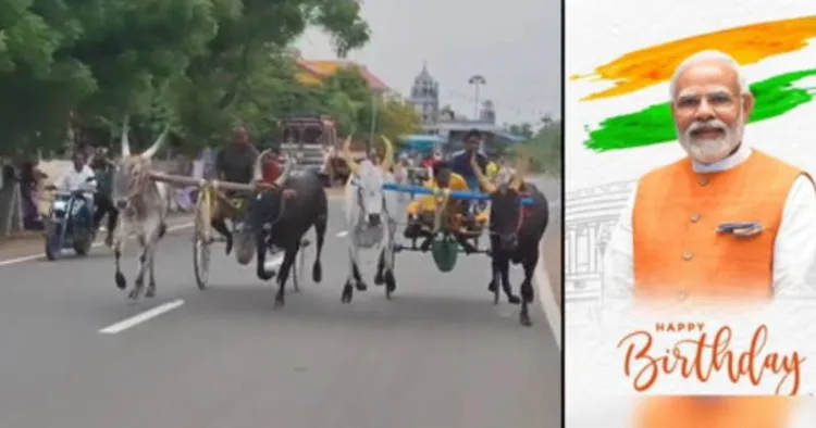 ராமநாதபுரம் மாவட்டம், திருவாடானை பகுதியில் பிரதமர் மோடியின் 75-வது பிறந்தநாளை ஒட்டி, மாட்டு வண்டி எல்கை பந்தயம் விமர்சையாக நடைபெற்றது.