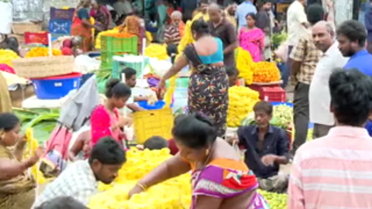 கோயம்பேடு மார்க்கெட்டில் பூஜை பொருட்கள் வெவ்வெறு இடங்களில் விற்கப்படுவதால் வியாபாரத்தில் சற்று தொய்வு ஏற்பட்டுள்ளதாக வியாபாரிகள் தெரிவித்துள்ளனர்.