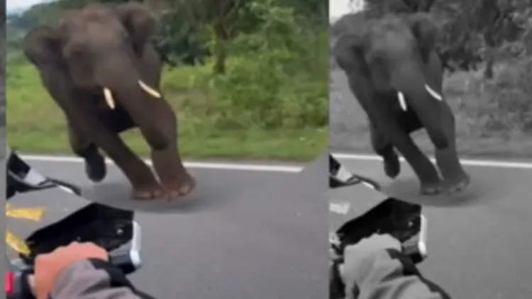 அப்போது திடீரென இருசக்கர வாகன ஓட்டியை யானை தாக்க வந்தது. அவர் உடனடியாக வாகனத்தை வேகமாக இயக்கியதால் நூலிழையில் உயிர் தப்பினார்.