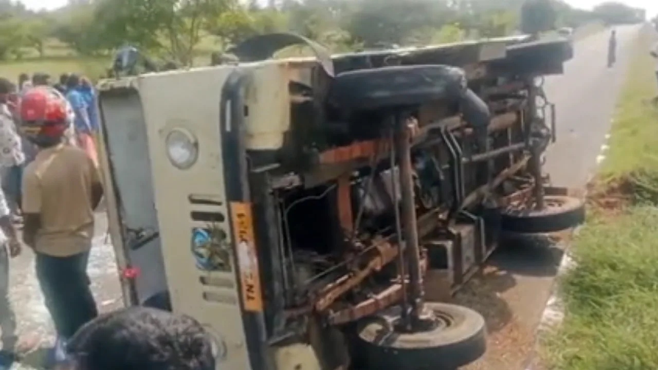 புலியூர் பகுதியில் வந்தபோது வாகனத்தின் டயர் வெடித்து விபத்துக்குள்ளானது. இதனால் ஓட்டுநரின் கட்டுப்பாட்டை இழந்த வாகனம், சாலையில் கவிழ்ந்தது.