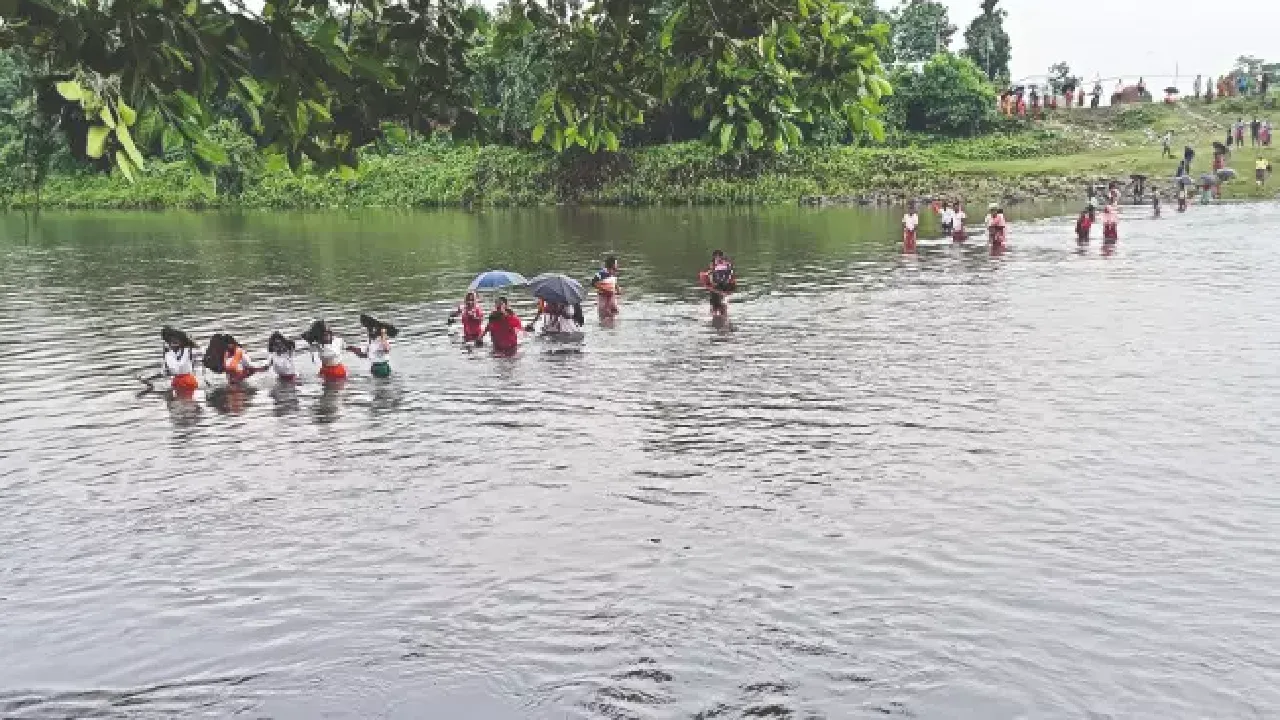 மேற்கு வங்க மாநிலம் ஜல்பைகுரி அருகே பாலம் இல்லாததால் மக்கள் நீரில் இறங்கி ஆற்றைக் கடக்கும் அவல நிலை ஏற்பட்டுள்ளது.