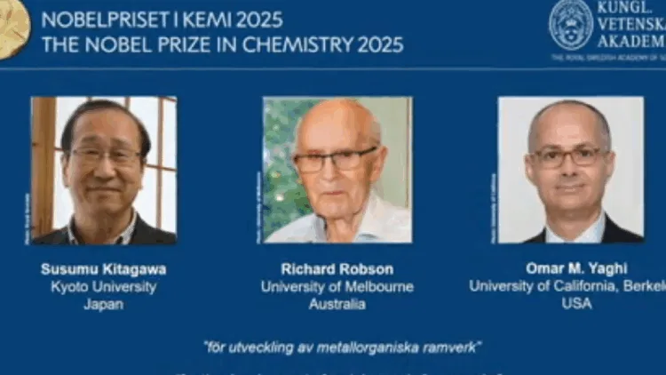இந்நிலையில், வேதியியலுக்கான நோபல் பரிசுகுறித்த அறிவிப்பு இன்று வெளியானது. அதில் ஜப்பானை சேர்ந்த சுசுமா கிடகவா, இங்கிலாந்தை சேர்ந்த ரிச்சர்ட் ராப்சன், ஜோர்டானை சேர்ந்த உமர் யாகி ஆகிய 3 விஞ்ஞானிகளுக்கு இந்த ஆண்டு வேதியியலுக்கான நோபல் பரிசு வழங்கப்படுவதாகத் தேர்வுக் குழு அறிவித்துள்ளது.