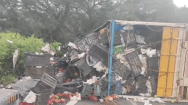 இதனால் பழப்பெட்டிகள் சாலை விழுந்தன. இதையடுத்து கிரேன் மூலம் வாகனம் அப்புறப்படுத்தப்பட்டு மாற்று வாகனம்மூலம் பழங்கள் ஏற்றுமதி செய்யப்பட்டன.