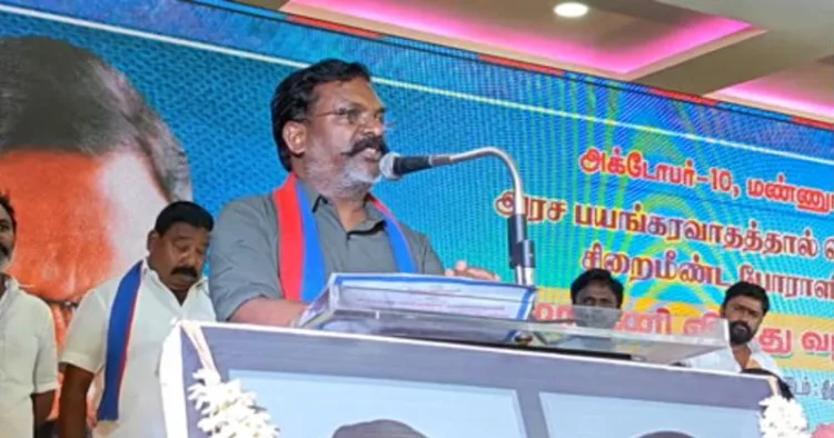 மேலும், கட்சி தொடங்குபவர்கள் எல்லாம் முதலமைச்சராக வேண்டும் என்று நினைப்பதாகவும், முதலமைச்சராவது தமக்கு பெரிதல்ல, தமது அரசியல் களம் வேறு, அதிகார களம் வேறு எனவும் கூறினார். நடிகர் பின்னால் செல்பவர்கள் விசிக நிர்வாகிகள் அல்ல எனவும் விஜய்யை மறைமுகமாக சாடினார்.