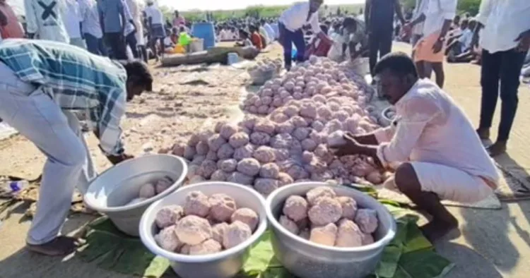 தொடர்ந்து கைகுத்தல் பச்சரிசியில் சமைக்கப்பட்ட சாதத்தை உருண்டைகளாக பிடித்து எல்லைப்பிடாரி அம்மனுக்கு படைத்து பூஜை செய்தனர். விழாவில் கலந்து கொண்ட ஆண்களுக்குப் பச்சரிசி சாத உருண்டைகள் மற்றும் இறைச்சிகள் பரிமாறப்பட்டது. இந்நிகழ்ச்சியில், சுற்றுவட்டார கிராமத்தைச் சேர்ந்த ஆயிரத்திற்கும் மேற்பட்ட ஆண் பக்தர்கள் கலந்து கொண்டு சுவாமி தரிசனம் செய்தனர்.