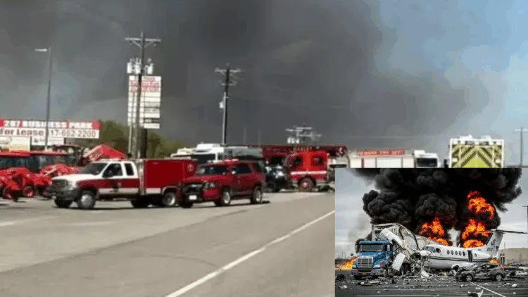 தொடர்ந்து தரையில் விழுந்த விமானத்தில் தீ விபத்து ஏற்பட்டு அருகில் இருந்த வாகனங்கள் மற்றும் கட்டிங்களுக்கும் பரவியது.