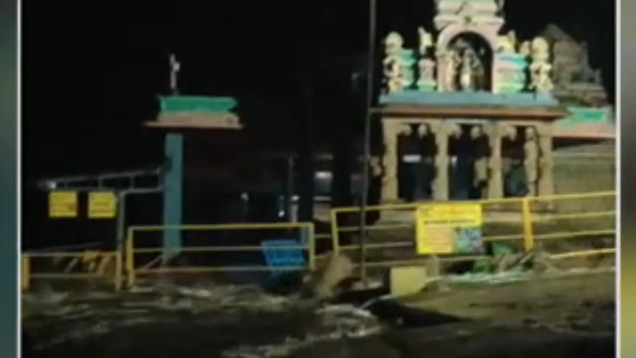 இதனால் பஞ்சலிங்க அருவியில் நீர் வரத்து அதிகரித்து அருகில் உள்ள அமணலிங்கேஸ்வரர் கோயிலை மூழ்கடித்தபடி வெள்ள நீர் சென்றது.