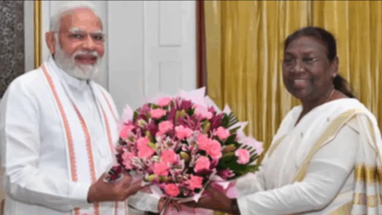 டெல்லி ராஷ்டரபதி பவனில் குடியரசுத் தலைவர் திரவுபதி முர்முவை நேரில் சந்தித்து பிரதமர் நரேந்திர மோடி பூங்கொத்து வழங்கித் தீபாவளி வாழ்த்து தெரிவித்தார்.