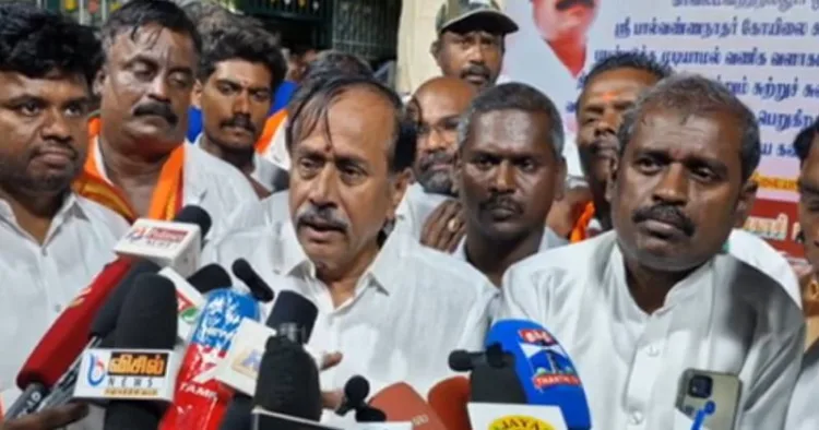 தென்காசி மாவட்டம், சங்கரன்கோவில் அருகே கரிவலம்வந்தநல்லூர் பகுதியில் உள்ள பால்வண்ண நாதர் கோயிலுக்கு சொந்தமான இடத்தில் வணிக வளாகம் கட்டுவதற்கு எதிர்ப்பு தெரிவித்து பாஜக மூத்த தலைவர் ஹெச்.ராஜா தலைமையில் கண்டன ஆர்ப்பாட்டம் நடைபெற்றது.