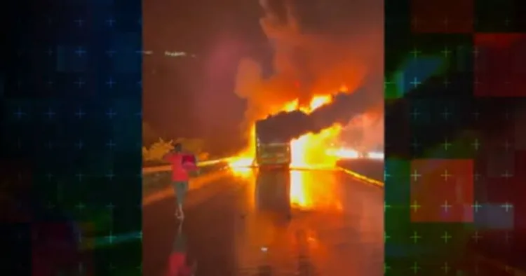 இதனால் செய்வதறியாது பயணிகள் தவித்த நிலையில, அவசரகால வழி மூலமாக 12 பயணிகள் வெளியே குதித்து உயிர் தப்பினர். கண் இமைக்கும் நேரத்தில் பேருந்து முழுவதுமாக பற்றி எரிந்ததில் 21 பயணிகள் உயிரிழந்ததாக தகவல் வெளியாகியுள்ளது.