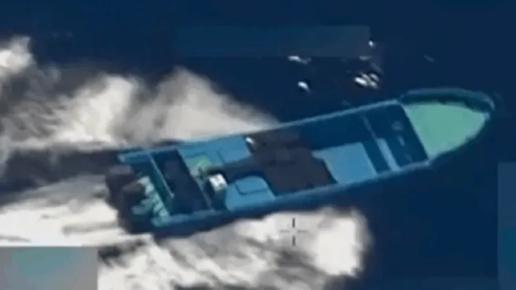 அந்த வீடியோவில், பழுப்பு நிற பைகள் நிரம்பிய சிறிய படகு ஒன்று கடலில் செல்வதும், சில வினாடிகளில் அது வெடித்து தீப்பற்றி எரியும் காட்சிகளும் இடம் பெற்றுள்ளன.