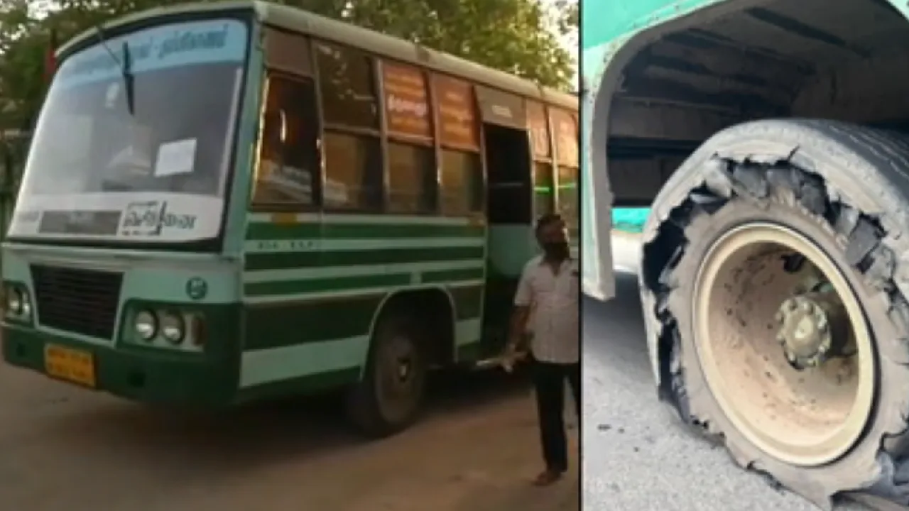 வாஞ்சூர் ரவுண்டானா அருகே பயணித்தபோது பேருந்தின் பின்புற டயர் பயங்கர சத்தத்துடன் வெடித்தது.