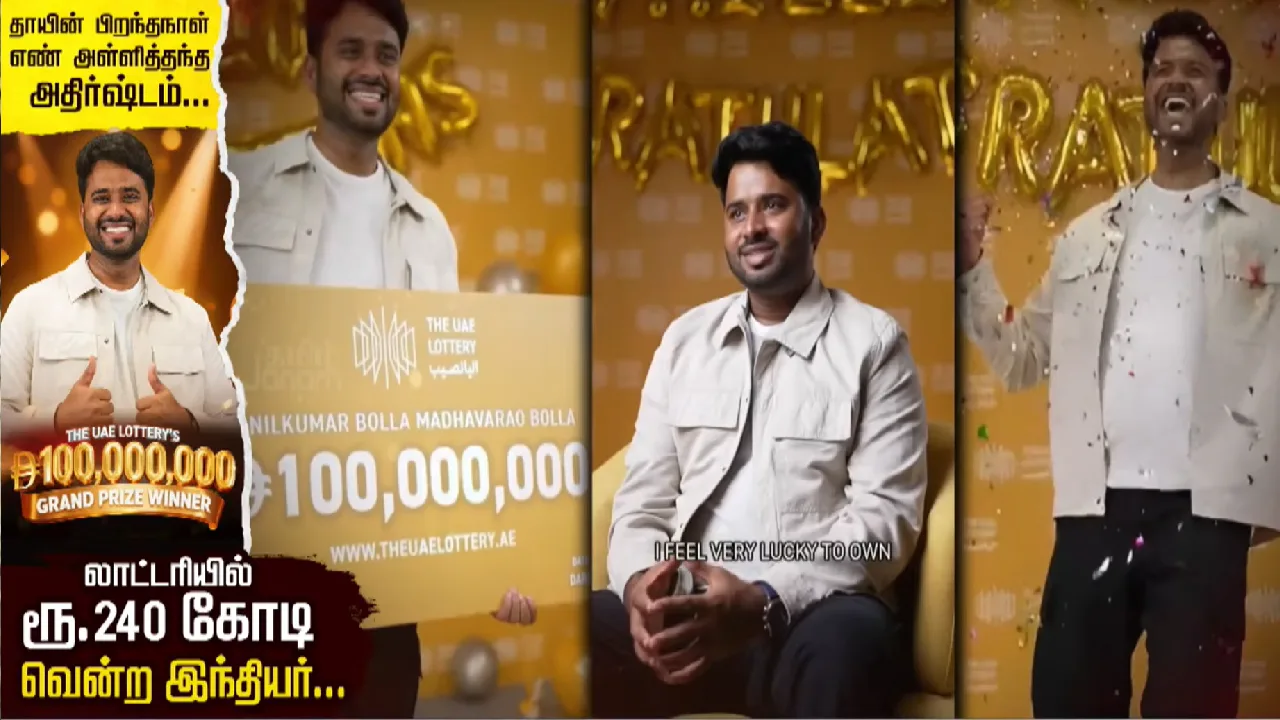 அபுதாபியில் வசித்து வரும் 29 வயது இந்தியரான அனில்குமார் போலா, ஐக்கிய அரபு அமீரக லாட்டரி வரலாற்றில் முதல் முறையாக 100 மில்லியன் திர்ஹாம், அதாவது இந்திய மதிப்பில் சுமார் 240 கோடி ரூபாய்க்கான ஜாக்பாட்டை வென்று, தனது வாழ்க்கையை ஒரே இரவில் மாற்றியுள்ளார். இதுகுறித்து விவரிக்கிறது இந்தச் செய்தி தொகுப்பு.