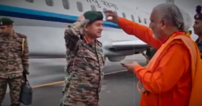 இந்திய ராணுவ தலைமை தளபதி உபேந்திர துவிவேதிக்கு திலகமிட்டு வரவேற்ற.வீடியோ இணையத்தில் வைரலாகியுள்ளது