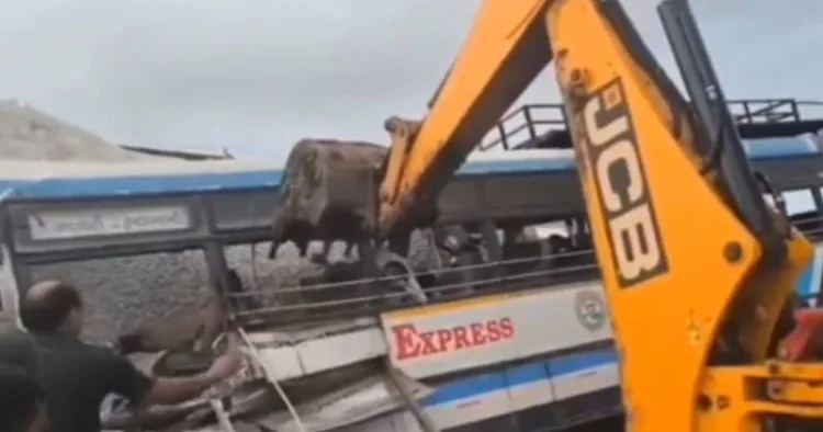 தெலங்கானா மாநிலம், ரங்காரெட்டி மாவட்டம், மிரியாலகுடா அருகே ஹைதராபாத் – பிஜாபூர் தேசிய நெடுஞ்சாலையில் 70 பயணிகளுடன் அரசு பேருந்து சென்று கொண்டிருந்தது.