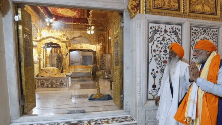 சீக்கியர்கள் போலவே, தலையில் டர்பன் கட்டிக்கொண்டு அங்கு வந்த பிரதமர் மோடி, தரையில் மண்டியிட்டு மனதார வணங்கினார்.
