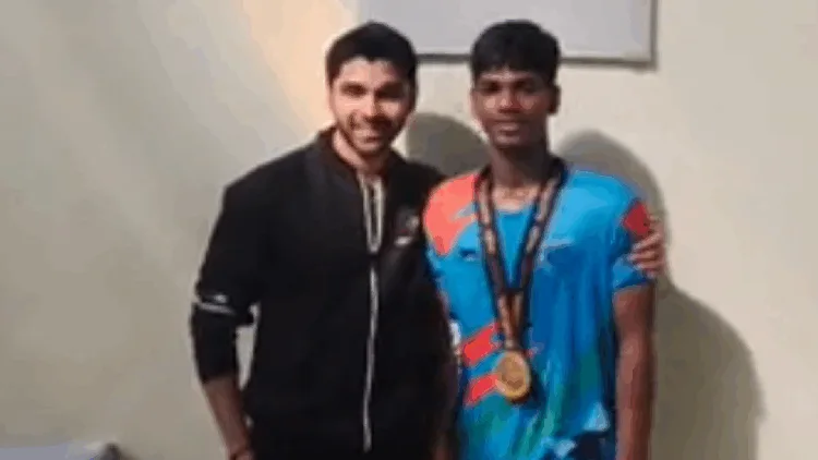 தங்கம் வென்ற கபடி வீரர் அபினேஷை நடிகர் துருவ் விக்ரம் நேரில் சந்தித்து பாராட்டினார்.