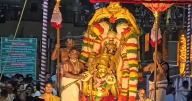 அந்த வகையில் நேற்று ஐப்பசி மாத பவுர்ணமியை முன்னிட்டு மலையப்ப சுவாமி தங்க கருட வாகனத்தில் நான்கு மாட வீதிகளில் உலா வந்து பக்தர்களுக்கு அருள்பாலித்தார். இதனை ஆயிரக்கணக்கான பக்தர்கள் கோவிந்தா கோஷங்கள் எழுப்பி தரிசித்தனர்.