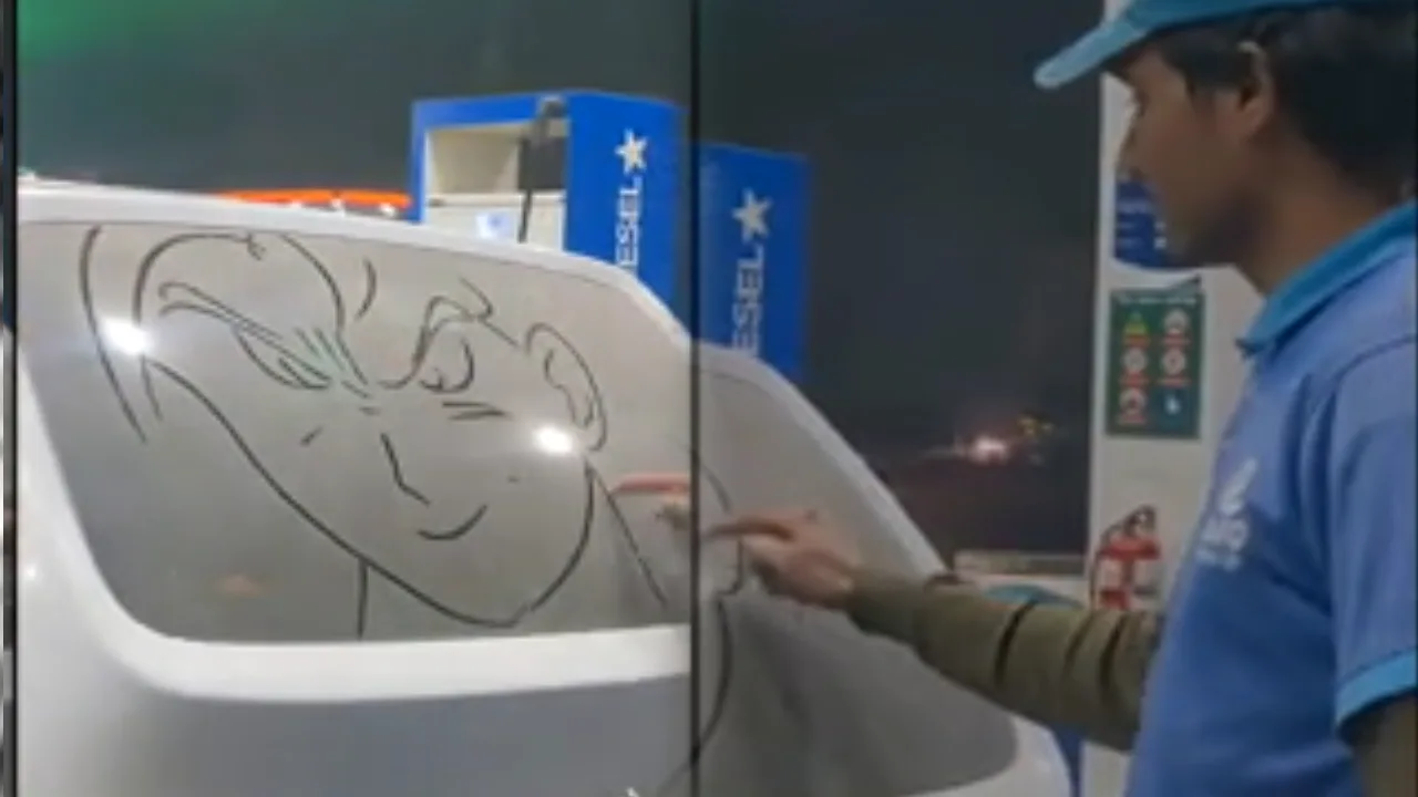 அப்போது தூசியால் மூடப்பட்ட காரின் பின்புற கண்ணாடியில், கோகு எனும் அனிம் கதாபாத்திரத்தைப் பெட்ரோல் பங்க் ஊழியர் தத்ரூபமாக வரைந்து அனைவரையும் வியப்பில் ஆழ்த்தினார்.