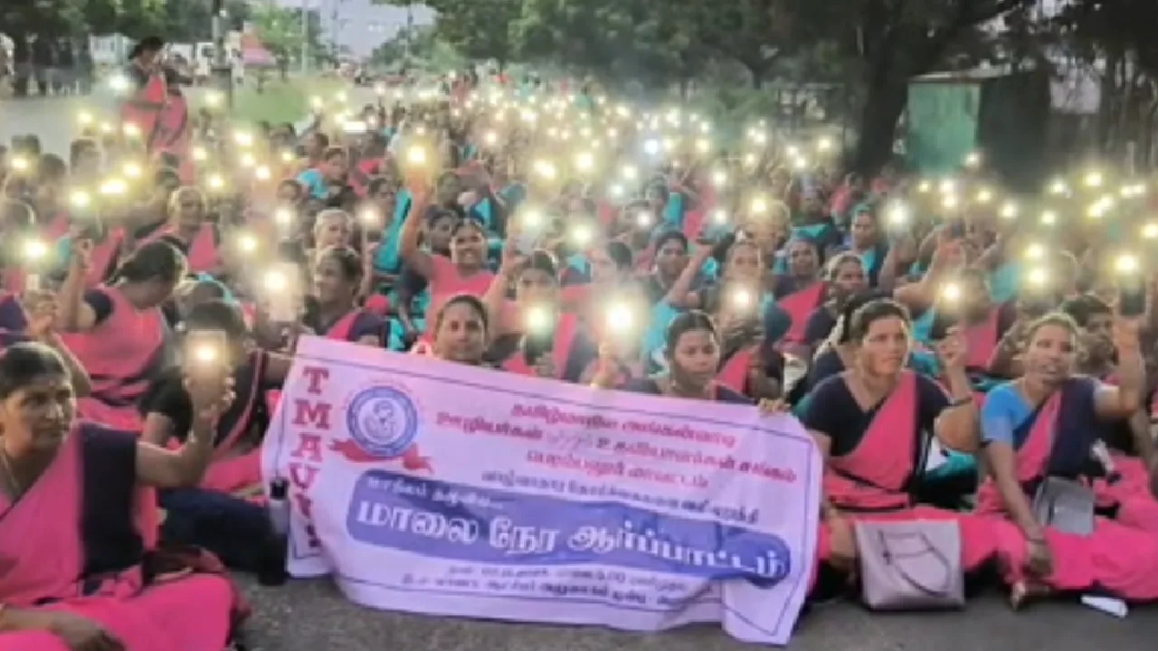 தொடர்ந்து, தமிழக அரசின் கவனத்தை ஈர்க்கும் வகையில் 300க்கும் மேற்பட்ட அங்கன்வாடி பணியாளர்கள் தங்களது செல்போன்களில் டார்ச் லைட் அடித்தவாறு ஆர்ப்பாட்டத்தில் ஈடுபட்டனர்.