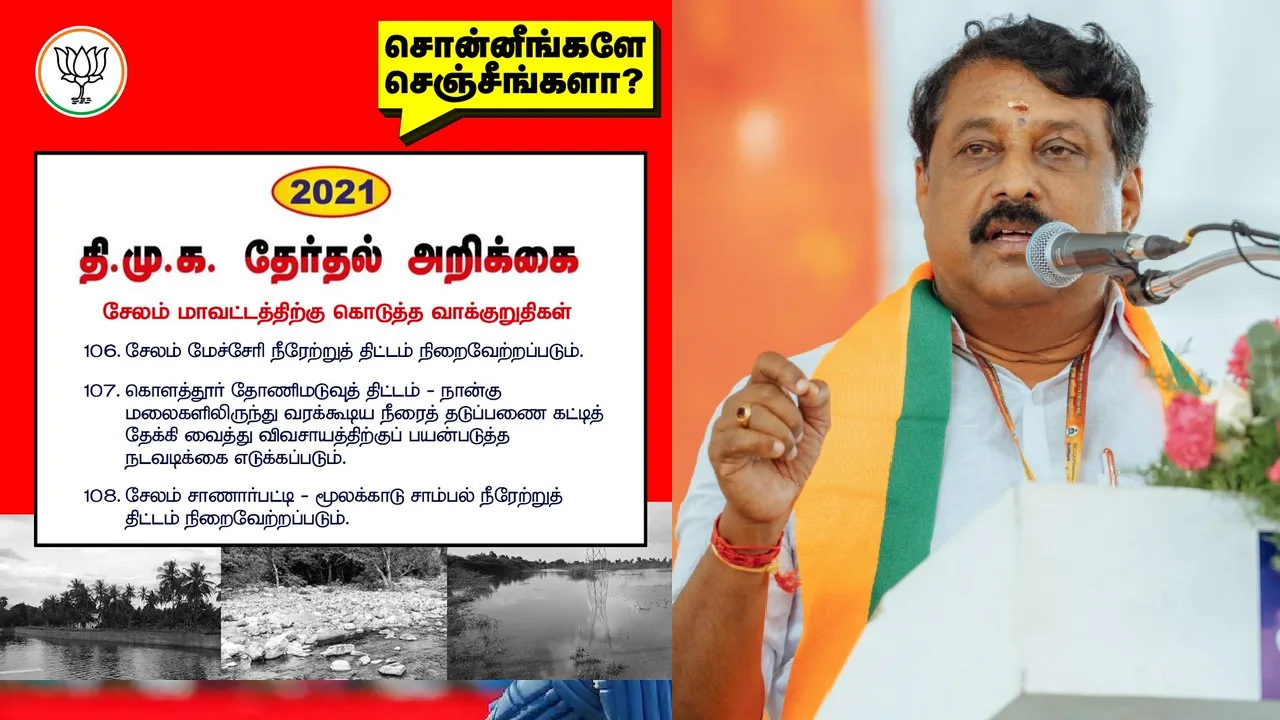 சேலம் மேச்சேரி நீரேற்றுத் திட்டம், கொளத்தூர் தோணிமடுவுத் திட்டம், சேலம் சாணார்பட்டி-மூலக்காடு சாம்பல் நீரேற்றுத் திட்டம் ஆகிய திட்டங்கள் நிறைவேற்றப்படும் என்று 2021 தேர்தல் வாக்குறுதியில் சொன்னீங்களே, செஞ்சீங்களா முதல்வர் ஸ்டாலின் அவர்களே? என்று நயினார் நாகேந்திரன் கேள்வி எழுப்பி உள்ளார்.