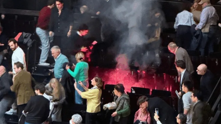 பாரிஸில் நடைபெற்ற இஸ்ரேல் குழுவினரின் இசை நிகழ்ச்சியில் போராட்டகாரர்கள் சிவப்பு நிற புகை குண்டைப் பயன்படுத்தி ரகளையில் ஈடுபட்டனர்.