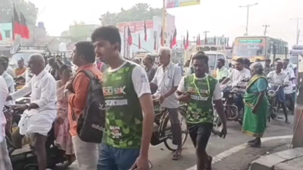 கரூரில் நடந்த மாரத்தான் போட்டியில் முறையான வழிகாட்டல் இல்லாததைக் கண்டித்து போட்டியாளர்கள் போராட்டத்தில் ஈடுபட்டதால் போக்குவரத்து பாதிக்கப்பட்டது.
