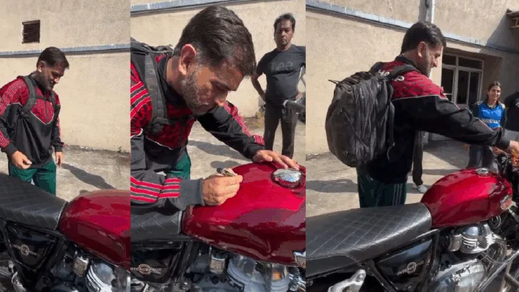 ரசிகரின் பைக்கில் எம்.எஸ். தோனி ஆட்டோகிராப் போட்ட வீடியோ வைரலாகி வருகிறது.