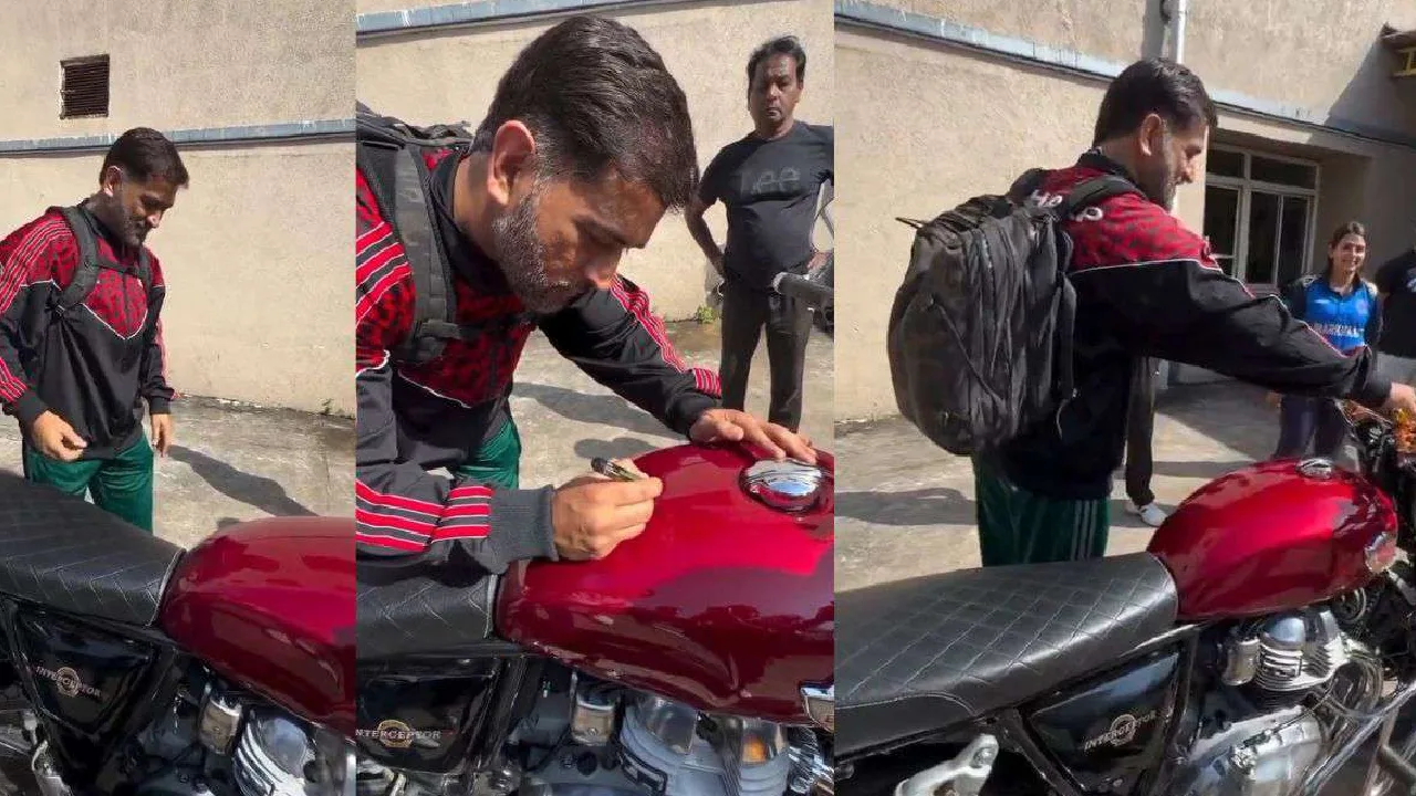 அந்த வகையில் ரசிகர் ஒருவரின் பைக்கில் எம்.எஸ். தோனி ஆட்டோகிராப் போட்ட வீடியோ ஒன்று இணையத்தில் வைரலாகி வருகிறது.