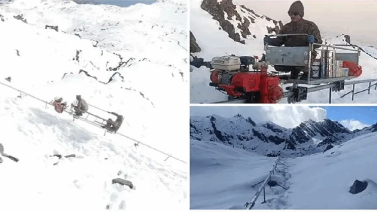 இதனால் அப்பகுதியில் உள்ள ராணுவ வீரர்களுக்கும், காவல் நிலையங்களுக்கும் அத்தியாவசியப் பொருட்களை கொண்டு செல்வது சவாலாக இருந்து வந்தது. இந்நிலையில், இந்திய ராணுவத்தின் கஜ்ராஜ் படைப்பிரிவினர், உள்நாட்டிலேயே உருவாக்கப்பட்ட மோனோ ரயிலை 16 ஆயிரம் அடி உயரத்திற்கு அமைத்துச் சாதனை படைத்துள்ளனர்.