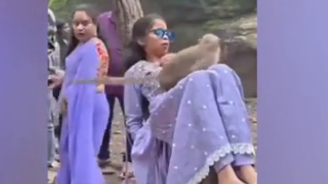 அப்போது, திடீரென அவர் மீது குரங்கு குதித்ததால், மிரண்டு போன அந்தப் பெண் அங்கிருந்து தெறித்து ஓடிய வீடியோ தற்போது சமூக வலைதளங்களில் வைரலாகி வருகிறது.