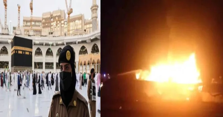 பேருந்து ஒன்று மெக்காவில் இருந்து மதீனாவுக்குப் சென்று கொண்டிருந்தது, இதில் இந்திய யாத்ரீகர்கள் பயணம் செய்ததாக தெரிகிறது. அப்போது திடீரென பேருந்து மீது டீசல் டேங்கர் லாரி மோதியது. இதில் பேருந்து தீப்பிடித்து எரிந்து முழுவதும் சேதமானது.