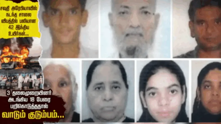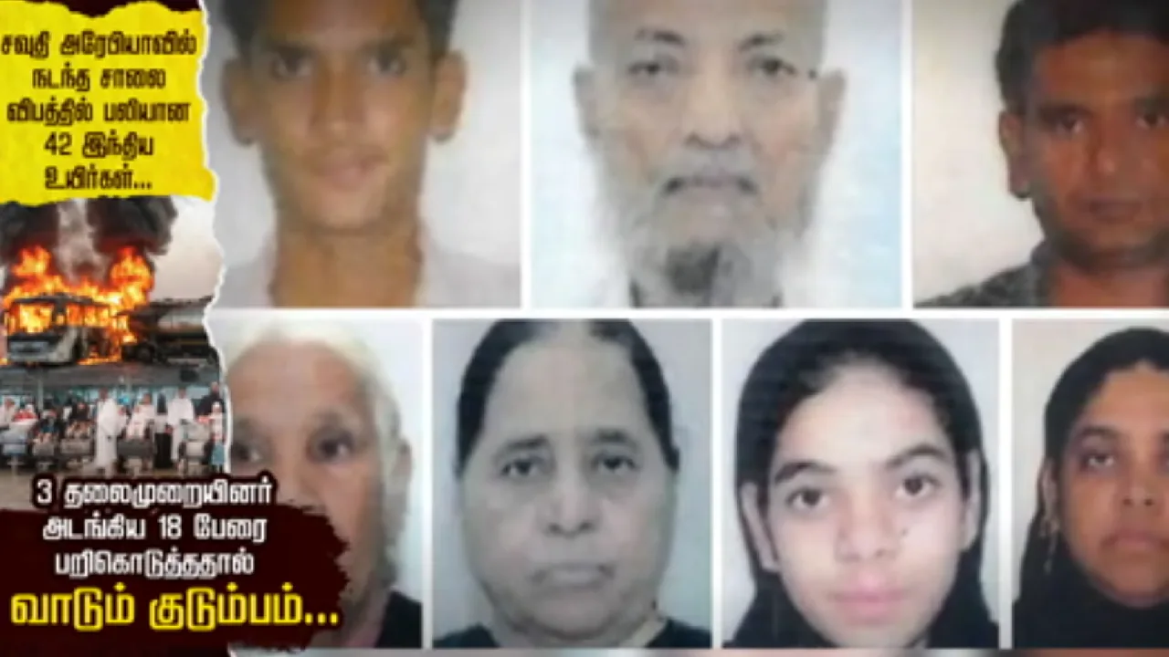 சவுதி அரேபியாவில் நடந்த கோர வாகன விபத்தில், புனித யாத்திரை மேற்கொண்டிருந்த இந்தியாவைச் சேர்ந்த 42 பயணிகள் பரிதாபமாக உயிரிழந்தனர். இதில் ஹைதராபாத்தில் இருந்து சென்ற ஒரே குடும்பத்தைச் சேர்ந்த 18 பேர் பலியாகியிருப்பது நாட்டு மக்களை பெரும் சோகத்தில் ஆழ்த்தியுள்ளது. விரிவாகப் பார்க்கலாம் இந்தச் செய்தி தொகுப்பில்.
