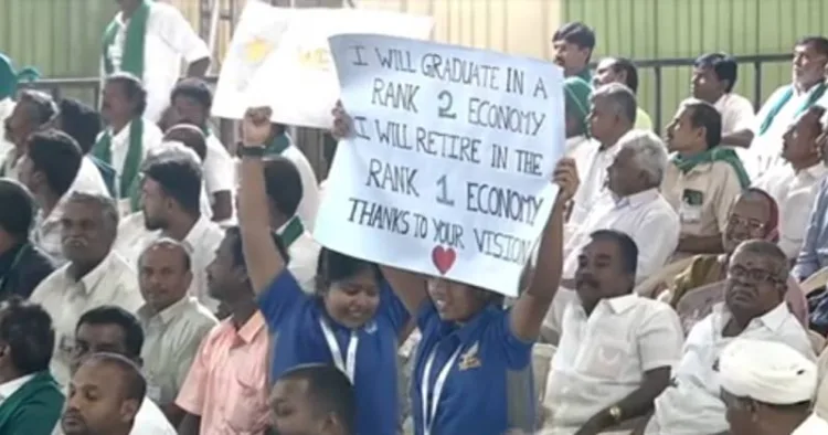 இயற்கை வேளாண் மாநாட்டின்போது பிரதமரின் பொருளாதார கொள்கைகளை பாராட்டி பதாகை ஏந்தியபடி நின்றிருந்த சிறுமிகளை பிரதமர் மோடி பாராட்டி பதாகையை பெற்றுக்கொண்டார்.