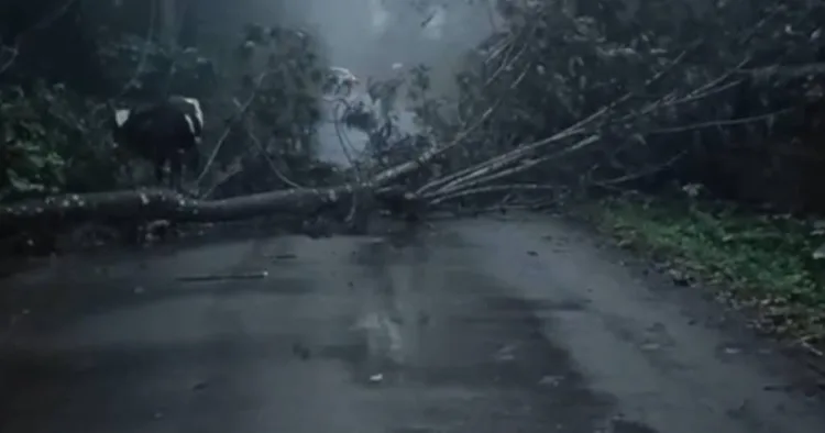 சேலம் மாவட்டம் ஏற்காட்டில் சாலையின் குறுக்கே விழுந்த மரத்தால் மின்கம்பம் சேதமடைந்து 5க்கும் மேற்பட்ட கிராமங்களுக்கு மின்சாரம் துண்டிக்கப்பட்டுள்ளது.