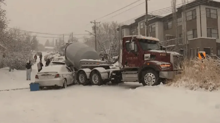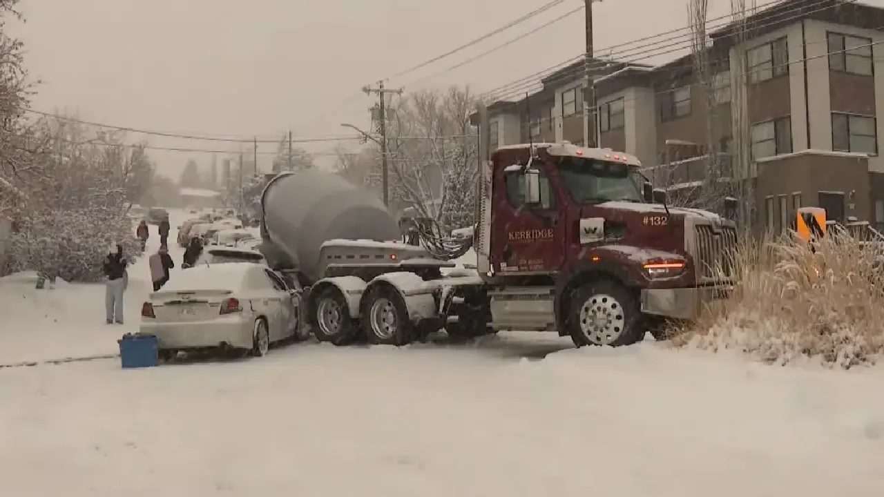 கனடாவில் கடும் பனிப்பொழிவால் சாலையில் நிறுத்தப்பட்டிருந்த கார் வழுக்கிச் சென்று மற்றொரு கார் மோதி விபத்துக்குள்ளானது.