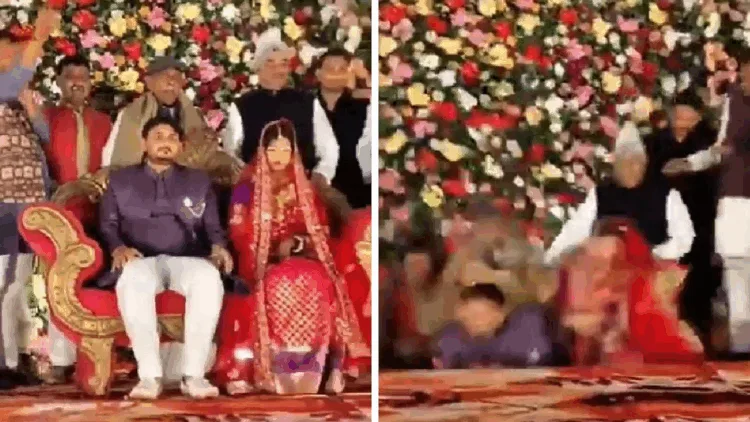 உத்தர பிரதேசத்தில் திருமண வரவேற்பு நிகழ்வில் மணமக்களை வாழ்த்த அரசியல் கட்சியினர் மேடைக்குச் சென்றபோது மேடை சரிந்து விழுந்தால் பரபரப்பு ஏற்பட்டது.