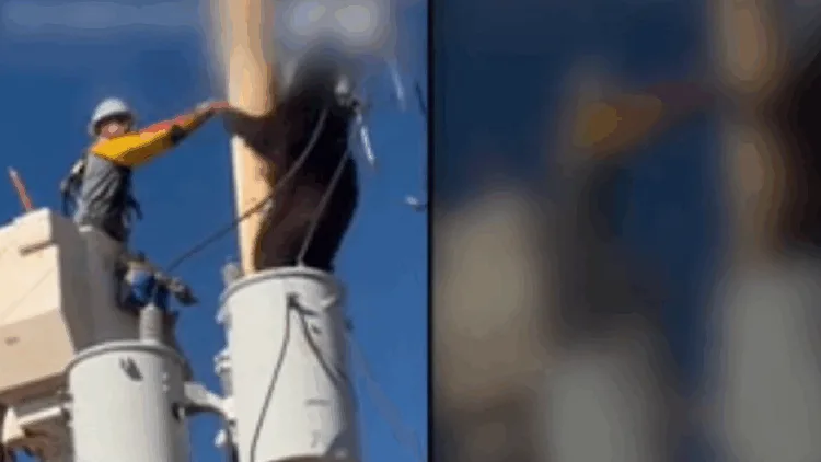 அமெரிக்காவின் அரிசோனாவில் மின்கம்பத்தில் ஏறிச் சிக்கி இருந்த கரடியை மின்வாரிய ஊழியர் துணிச்சலுடன் செயல்பட்டு கீழே இறங்க செய்தார்.