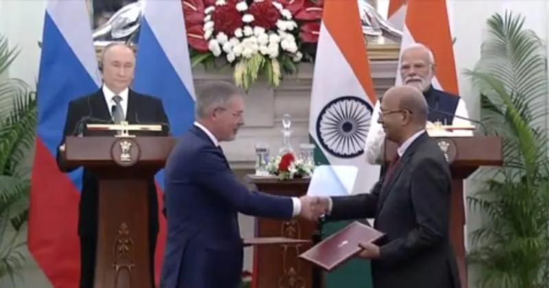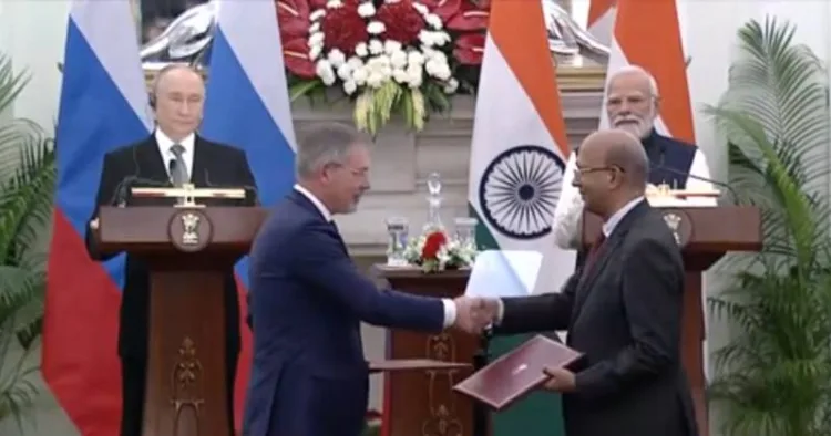 இந்தியா-ரஷ்யாவின் 23வது உச்சி மாநாட்டில் பங்கேற்க புதின் டெல்லிக்கு வருகை தந்துள்ளார். அவருக்கு பிரதமர் மோடி, குடியரசுத் தலைவர் திரெளபதி முர்மு ஆகியோர் சிறப்பான வரவேற்பு அளித்தனர். இந்நிலையில், பிரதமர் மோடி மற்றும் புதின் முன்னிலையில் இருநாடுகளிடையே முக்கிய ஒப்பந்தங்கள் கையெழுத்தாகின.