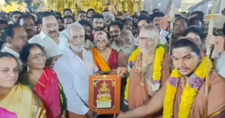 காஞ்சிமடம் மற்றும் பொதுமக்களின் பங்களிப்புடன் செய்யப்பட்ட காஞ்சி ஏகாம்பரநாதர் கோயில் தங்கத்தேரை, அறநிலையத்துறை அமைச்சர் சேகர்பாபுவிடம் விஜயேந்திர சரஸ்வதி சுவாமிகள் ஒப்படைத்தார்.