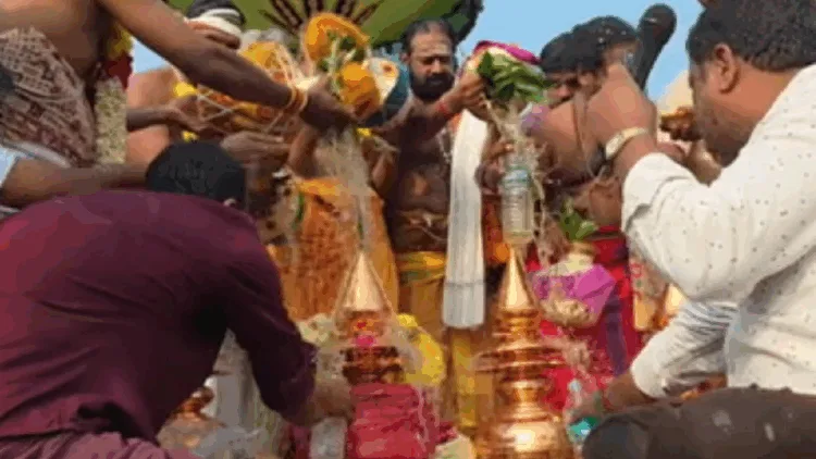 இதனை தொடர்ந்து, மங்கள வாத்தியங்கள் முழங்கக் கலசங்கள் முக்கிய வீதிகளில் ஊர்வலாக எடுத்துவரபட்டு கோயில் கோபுரத்தின் மீது புனித நீர் ஊற்றப்பட்டு கும்பாபிஷேக விழா கோலாகலமாக நடைபெற்றது.
