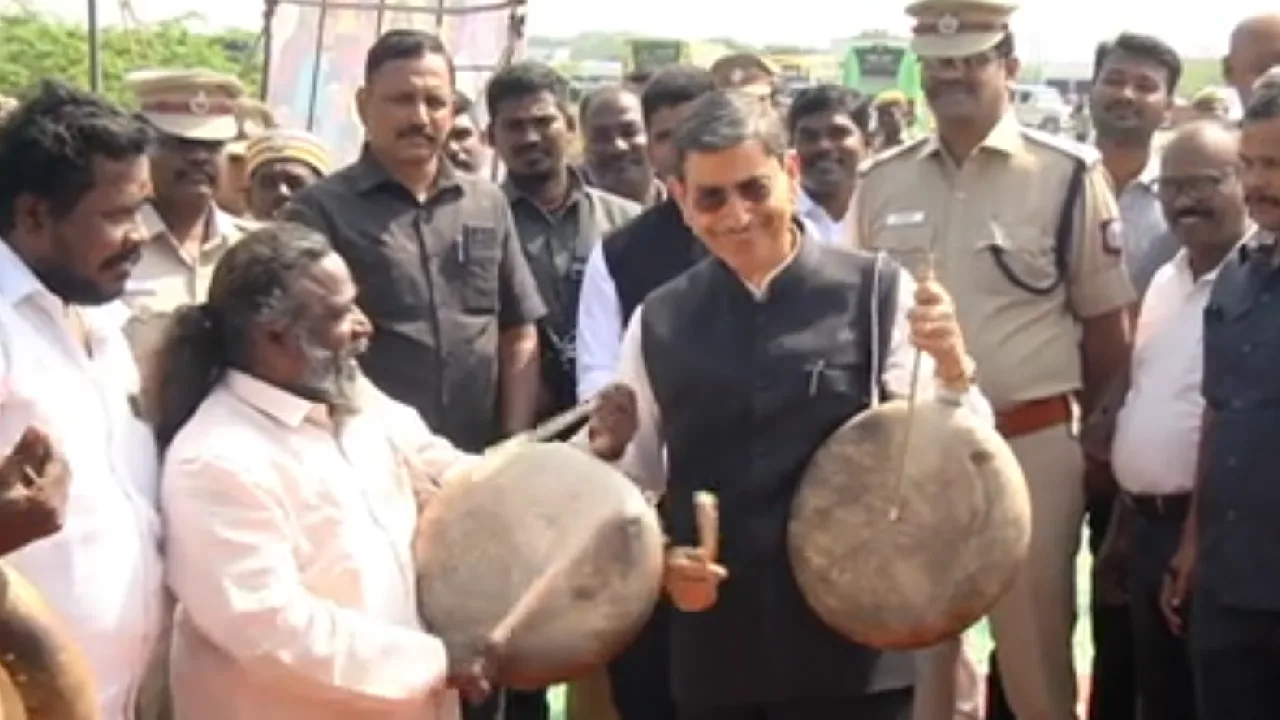 விருதுநகரில் நடைபெற்ற பாரதி பறை பண்பாட்டு மைய திறப்பு விழாவில் கலந்துகொண்ட ஆளுநர் ஆர்.என்.ரவி, பறை இசைத்து மகிழ்ச்சியை வெளிப்படுத்தினார்.