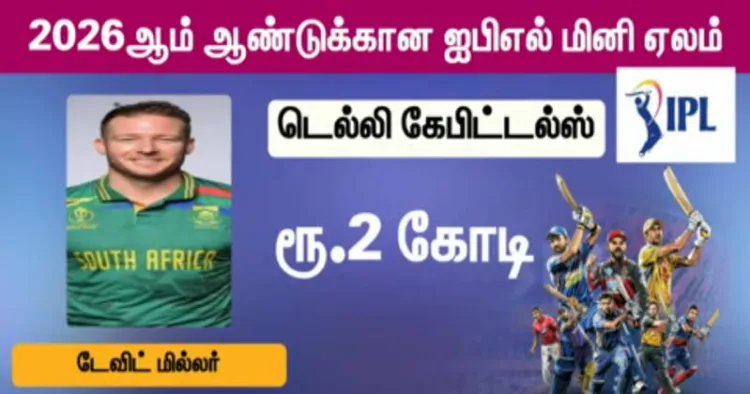 2026ஆம் ஆண்டுக்கான ஐபிஎல் தொடரின் மினி ஏலம், ஐக்கிய அரபு அமீரக தலைநகர் அபுதாபியில் நடைபெற்றது. மொத்தமாக 237 கோடி ரூபாயை ஏலத்திற்காக அணிகள் வைத்திருந்த நிலையில், தென்னாப்பிரிக்க அணி வீரர் டேவிட் மில்லரை 2 கோடி ரூபாய்க்கு டெல்லி கேபிட்டல்ஸ் அணி ஏலம் எடுத்தது.