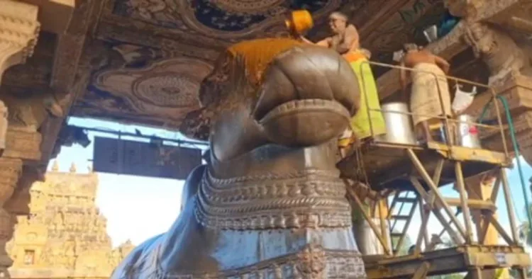 தஞ்சை பெரிய கோயிலில் உள்ள மஹா நந்தியம் பெருமானுக்கு பக்தர்களால் காணிக்கையாக வழங்கப்பட்ட மஞ்சள், அரிசிமாவு, பஞ்சாமிர்தம், பால், தயிர், சந்தனம் உள்ளிட்ட பல்வேறு வகையான பொருட்களை கொண்டு சிறப்பு அபிஷேகம் நடைபெற்றது.