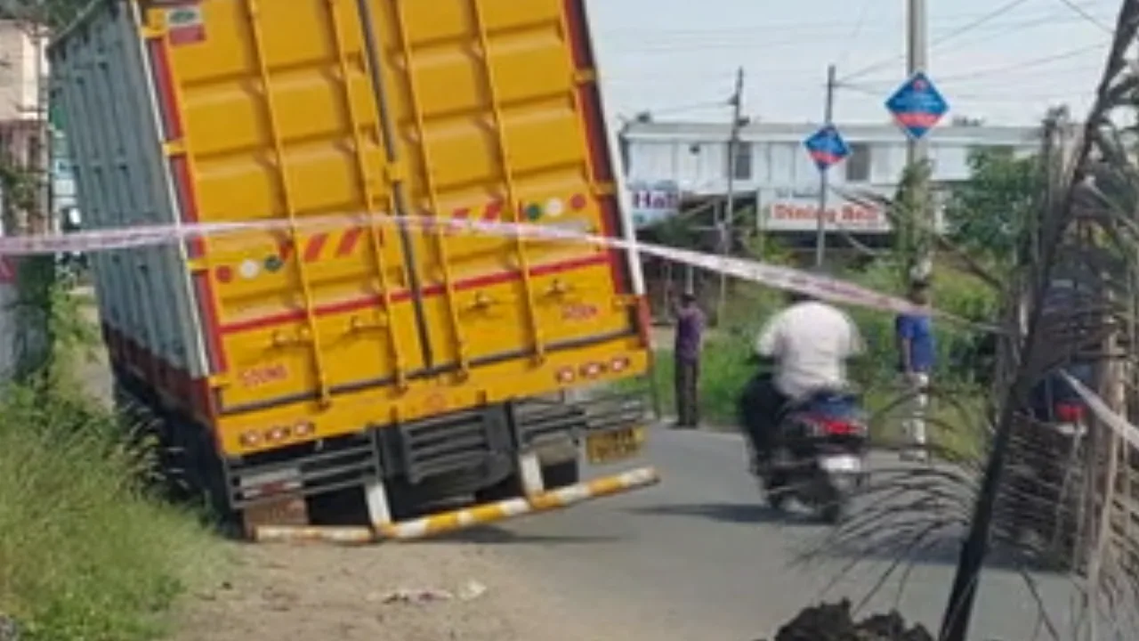 இதனால், அப்பகுதியில் போக்குவரத்து நெரிசல் ஏற்பட்டது. இதையடுத்து சம்பவ இடத்திற்கு வந்த போக்குவரத்து போலீசார், லாரியை மீட்கும் பணியில் ஈடுபட்டனர்.