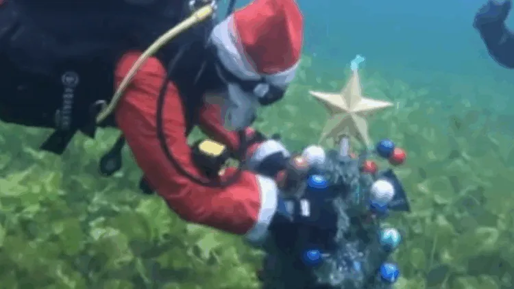 நீச்சல் வீரர்களில் ஒருவர் வழக்கமான ஸ்கூபா டைவிங் உடையைப் பயன்படுத்தாமல் கிறிஸ்துமஸ் தாத்தா உடையை அணிந்திருந்தார்.