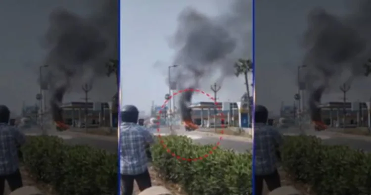 சுதாரித்துக் கொண்ட ஓட்டுநர் ஹேண்ட் பிரேக்கை அழுத்தவே, கட்டுப்பாட்டை இழந்த ஆம்னி வேன், தீப்பிடித்தபடி பெட்ரோல் நிலையத்திற்குள் புகுந்தது. துரிதமாக செயல்பட்ட பெட்ரோல் நிலைய ஊழியர்கள், தீயணைப்பான்களை பயன்படுத்தி தீயை கட்டுப்படுத்தினர். இதனால் பெரும் அசம்பாவிதம் தவிர்க்கப்பட்டது.