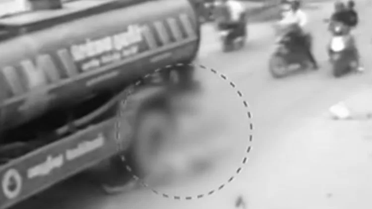 சென்னை மாதவரம் அருகே சாலையில் தவறி விழுந்த பெண் மீது தண்ணீர் லாரி மோதிய காட்சி வெளியாகி உள்ளது.