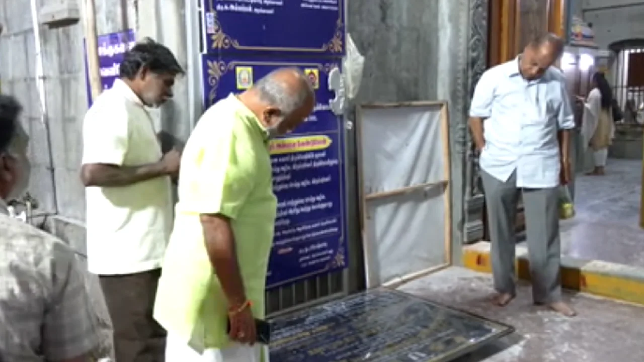 பொதுவாக, தங்கக் கவசம் போன்ற ஆபரணங்களை வழங்குபவர்களுக்குக் கல்வெட்டு வைக்கப்படுவதில்லை என்கிற நிலையில், திமுகவினர் முதல்வர், துணை முதல்வர், துறை மற்றும் உள்ளூர் அமைச்சர்களின் பெயர்கள் அடங்கிய கல்வெட்டை வைத்துள்ளனர்.